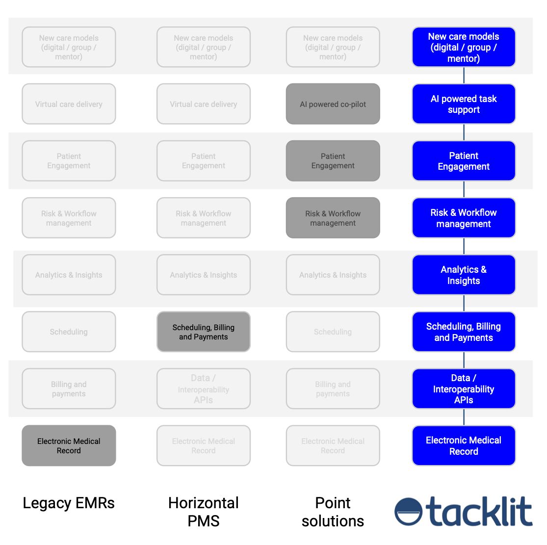 But Tacklit saw an opportunity to build a product that is (1) focused on the mental health vertical and (2) provides the majority of these solutions under one roof and (3) has an open architecture that allows other point solutions to plug into their platform where appropriate. They saw the opportunity to not just take care of the back-office admin tasks, but to also provide a care delivery system that improves clinician experience and patient outcomes.