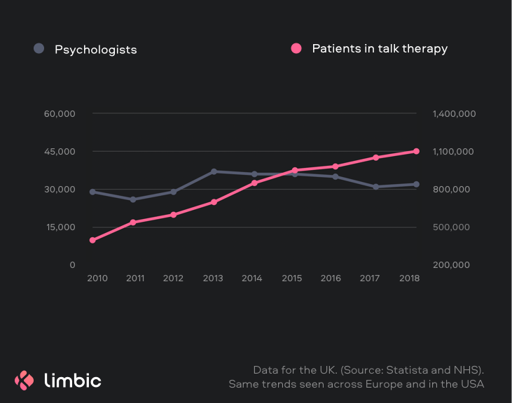 First, there is a massive treatment supply-demand gap (I explored this in my article on Limbic a few weeks back). Our main methods of treatment (talk therapy) rely on the labour of highly skilled (and highly expensive) professionals. And unfortunately, there’s not enough of them to meet the demand for care. While this problem exists, there will always be patients not getting the care they need.