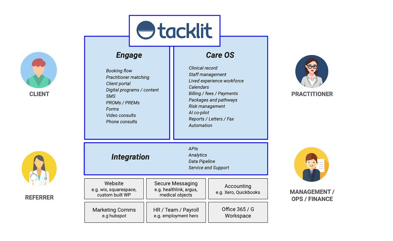 One way of summarising Tacklit’s strategy is to say they want to be the “one-stop shop” for mental health providers. It’s a great strategy that has created many leaders in other industries (Xero for accounting, Shopify for eCommerce, HubSpot for marketing etc.). The strategy is to define all the “jobs to be done” by a certain customer group and then build a product that puts them all under one roof.
