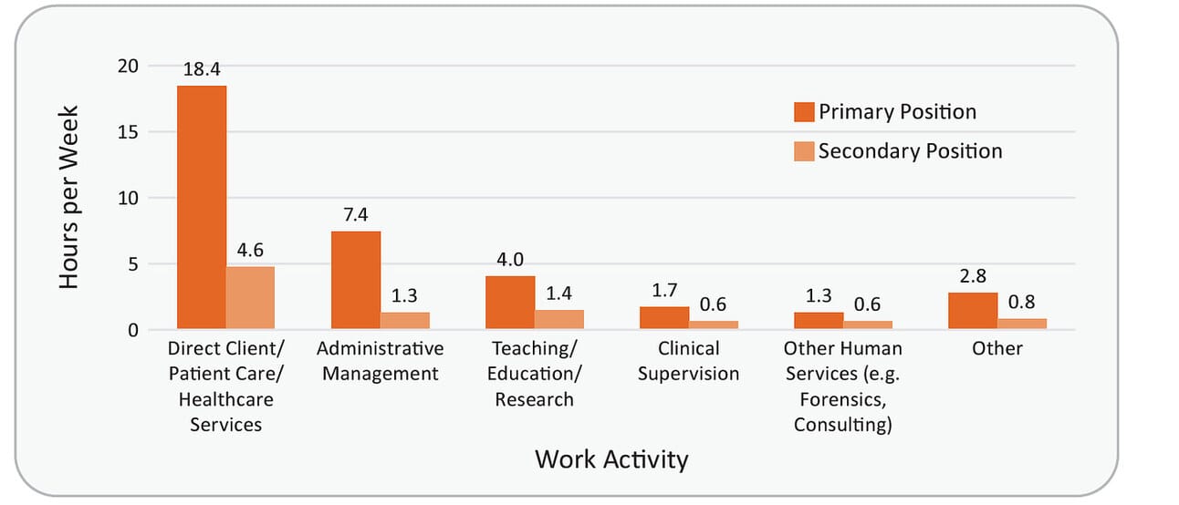 According to a 2015 APA study, the average mental health professional works 46 hours per week in the US. Of this time, only about 50% of their time is spent on direct patient care.