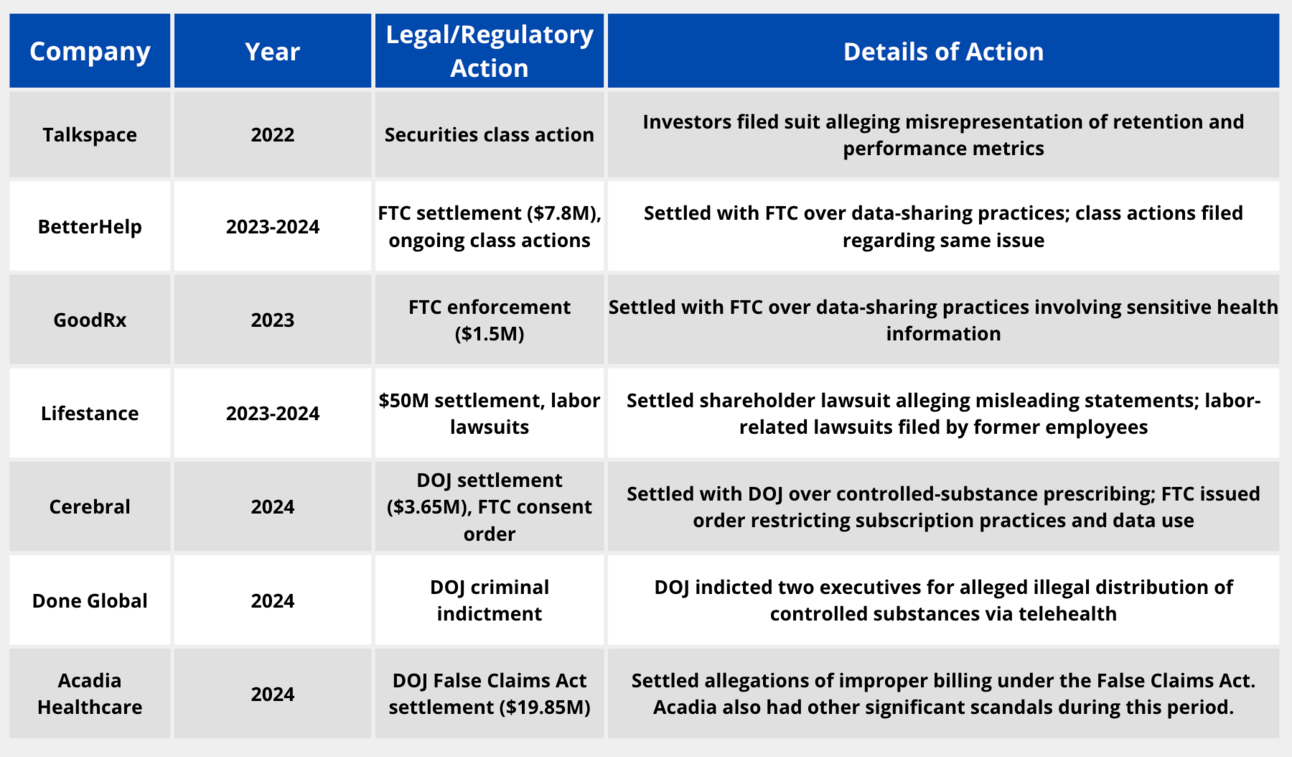 From 2021 through 2025, a steady stream of legal and regulatory actions raised concerns around how care was being delivered, marketed, and protected by mental health businesses. On top of lawsuits, federal agencies issued fines, ordered consumer refunds, and placed new limits on how companies engage with and handle user data. Around the same time, studies flagged that roughly 60% of apps raised privacy concerns or made unsupported claims. In parallel, lawmakers began pushing for stronger standards.