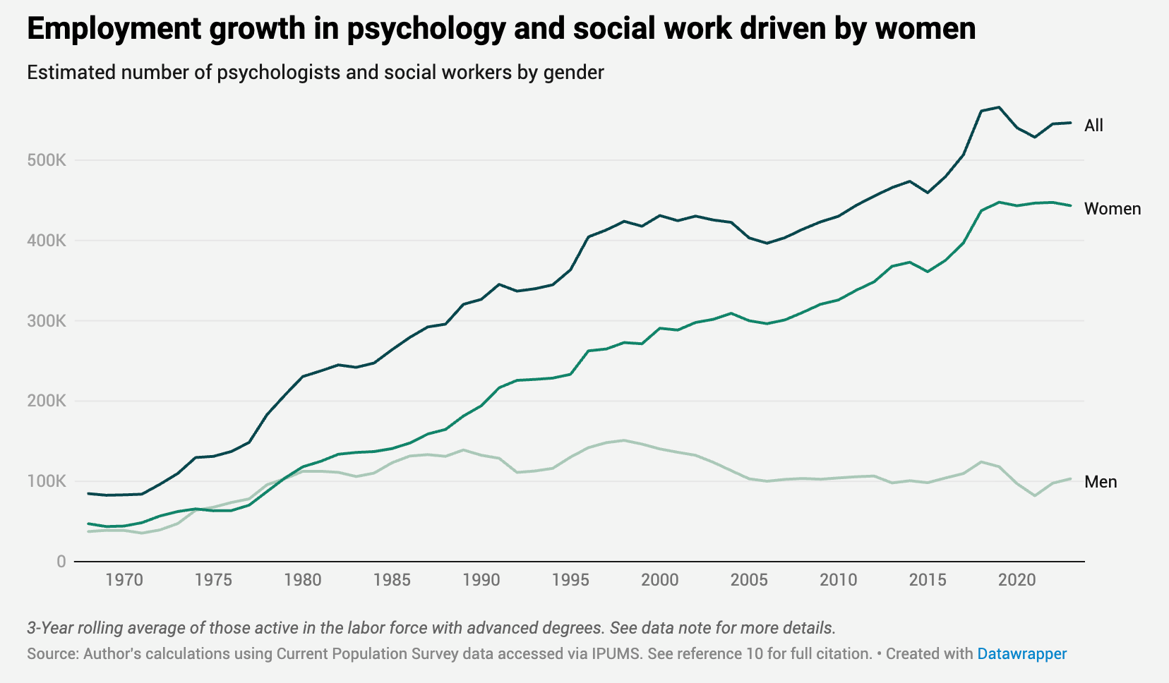 I had originally considered whether this prediction might be “The US reaches peak therapy”, but there are still strong drivers on both the demand and supply side. Rates of mental illness and general distress appear to still be rising, and the supply of therapists also still appears to be increasing2 .