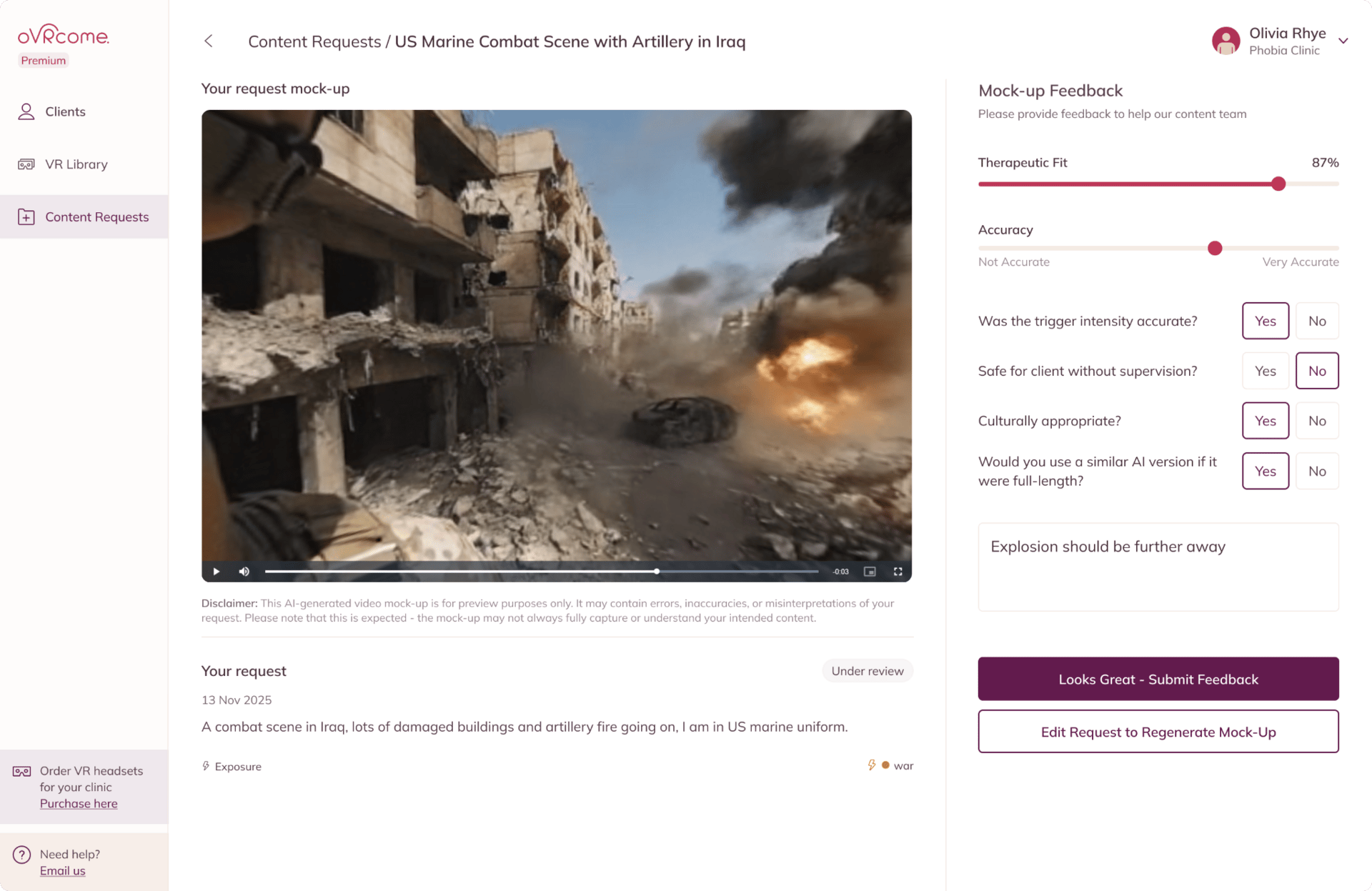 This generates a very specific prompt, which is then fed into a generative video model, currently Sora or Veo3, which creates the base scene for the exposure. The oVRcome team then run a quality and safety check and either iterate on the scene or, if they’re satisfied, move it into the clinician’s portal for them to use.